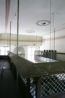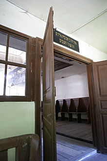 Eingang zum Betsaal | Inschrift über der Tür: Jakobs Traum von der Himmelsleiter. Erstes Buch Mose, 28-12 | Treppe zur Frauen-Empore | Blick von der Empore | Geländer-Detail | Treppe runter zum Erdgeschoss | ||||||||