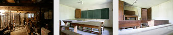 Der Schulraum im Erdgeschoss der Synagoge ist noch komplett erhalten, mit Schreibpulten und Bänken, einem alten Wandschrank und einer Tafel.