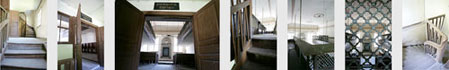 Über eine Treppe gelangt man in die erste Etage. Am Eingang des Betsaals, der traditionell Richtung Osten (Jerusalem) ausgerichtet ist und hier aufgrund der festgelegten Lage durch die Stadtmauer eher nach Süden weist, befindet sich über der zweiflügeligen Tür eine Inschrift in goldenen Buchstaben auf schwarzem Hintergrund.